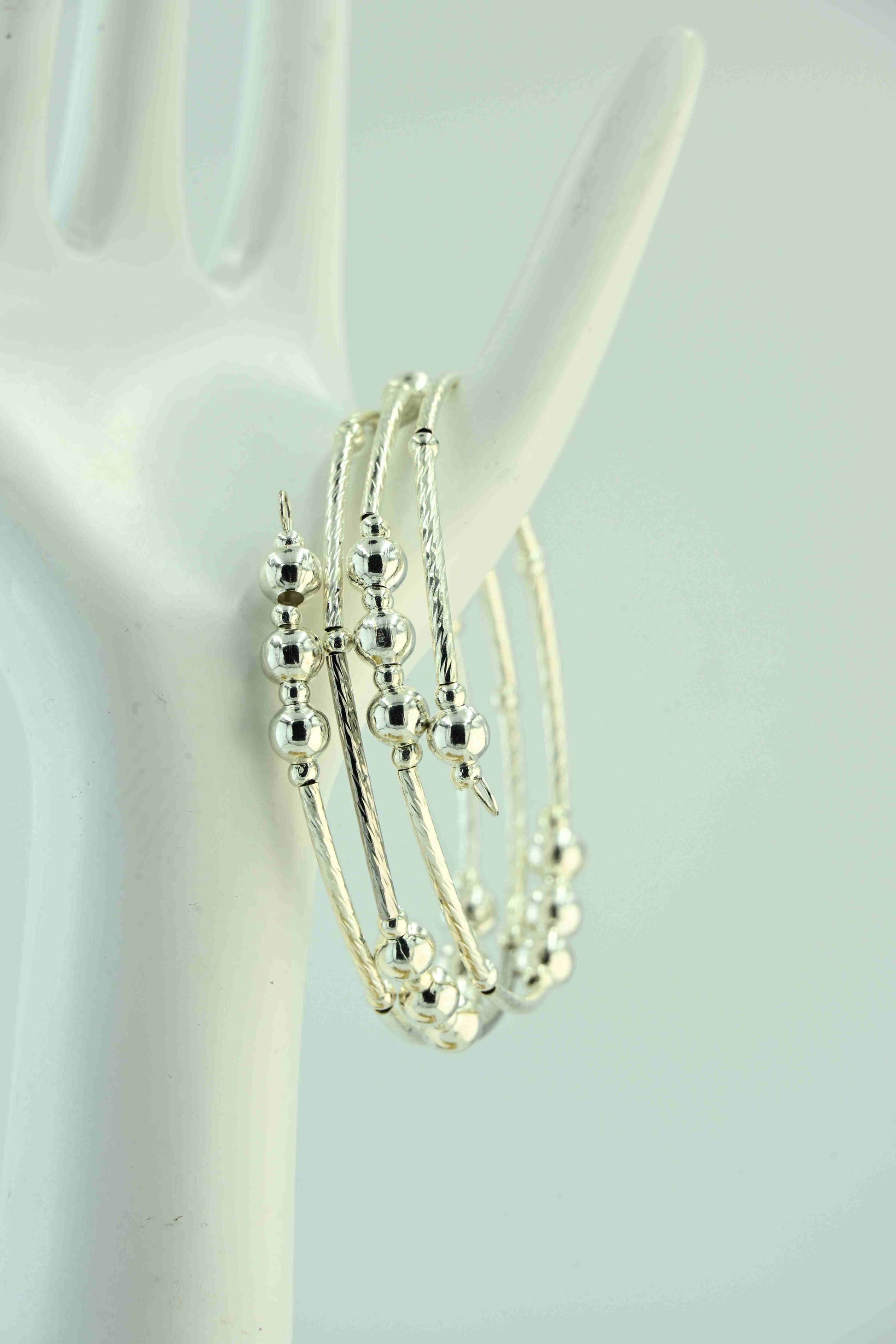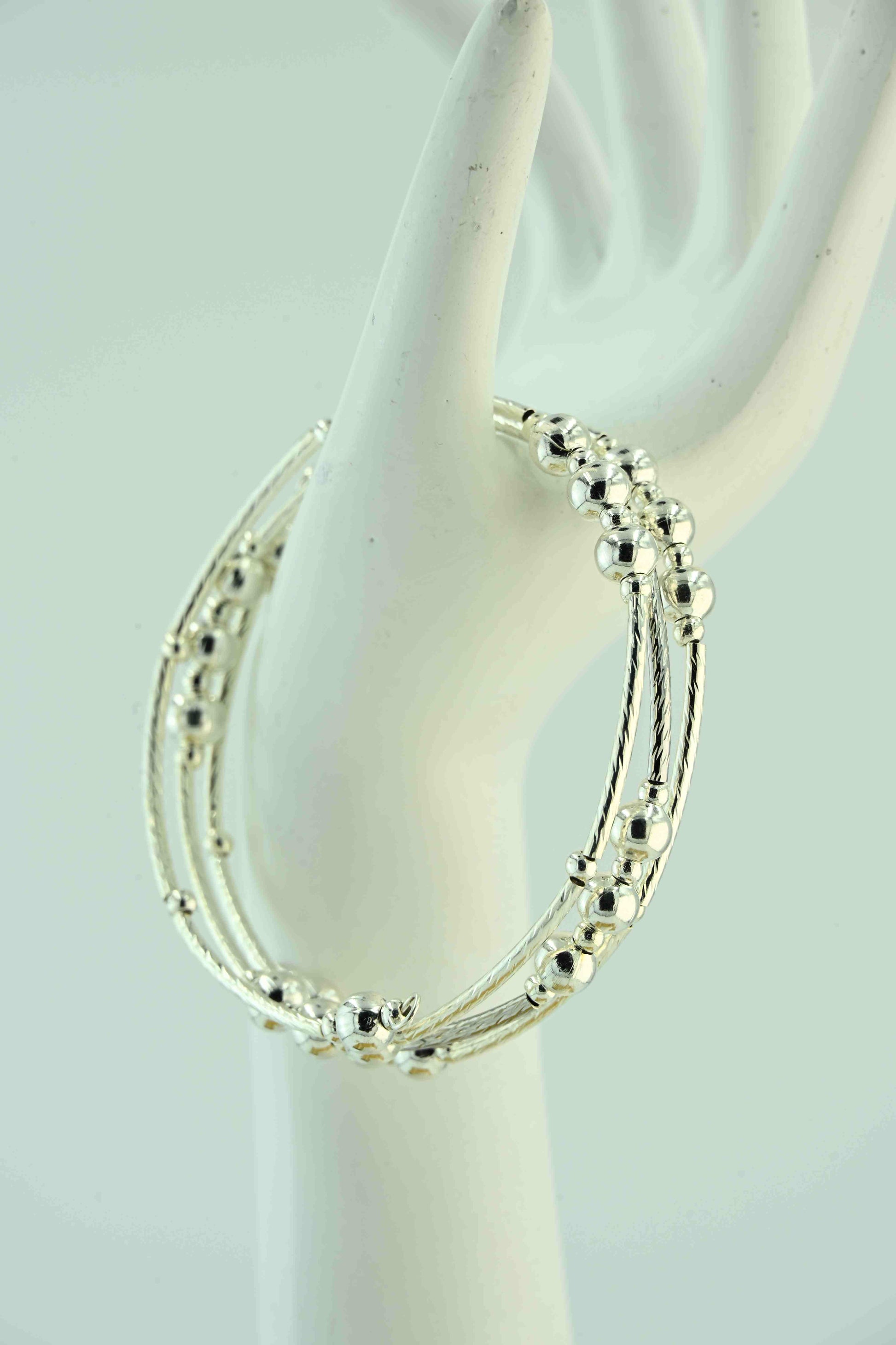 Stylowa i elegancka bransoletka wykonana na drucie pamięciowym, który doskonale dopasowuje się do nadgarstka. W całości utrzymana w srebrnym odcieniu, z drobnymi, błyszczącymi koralikami rozmieszczonymi w harmonijnych odstępach.