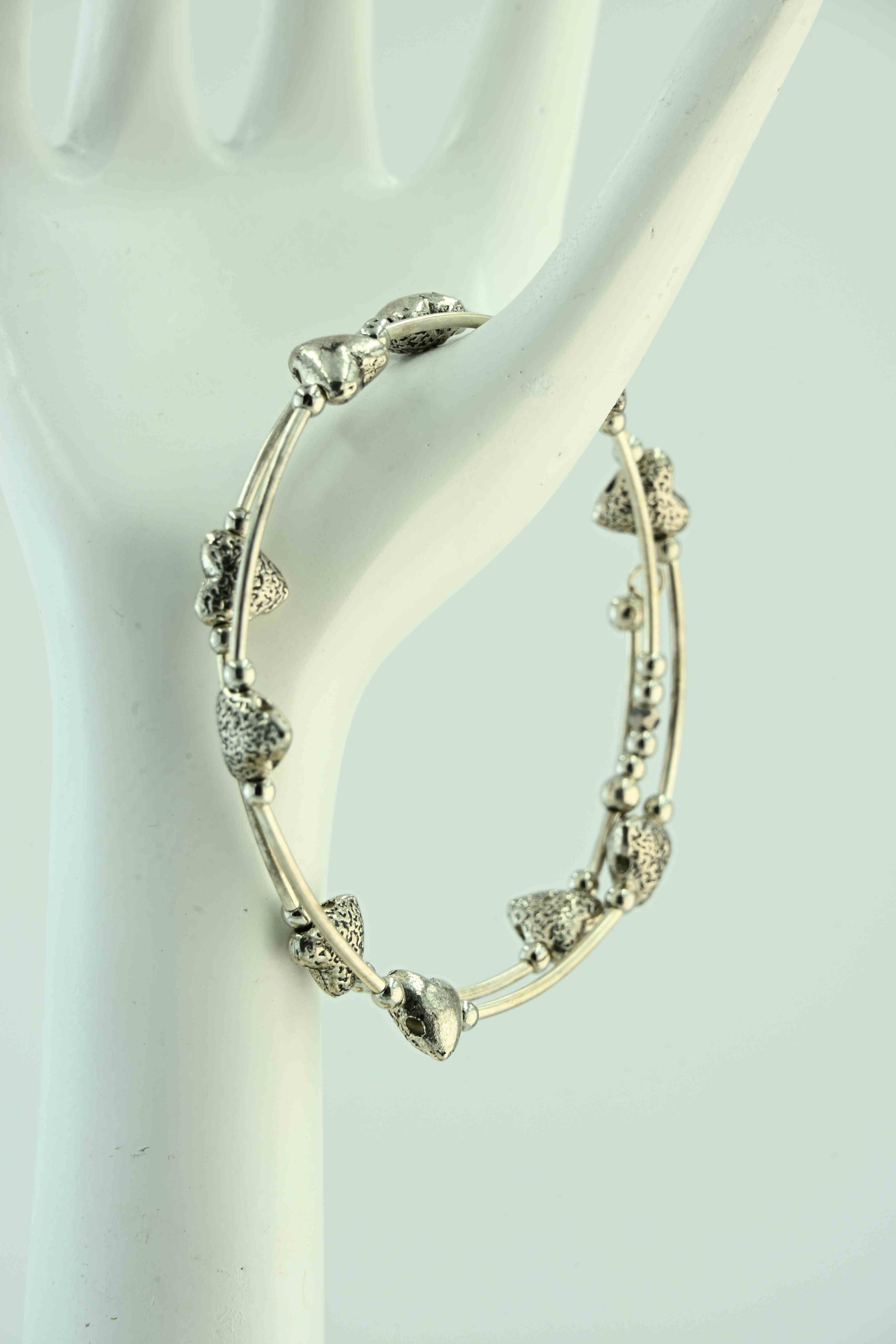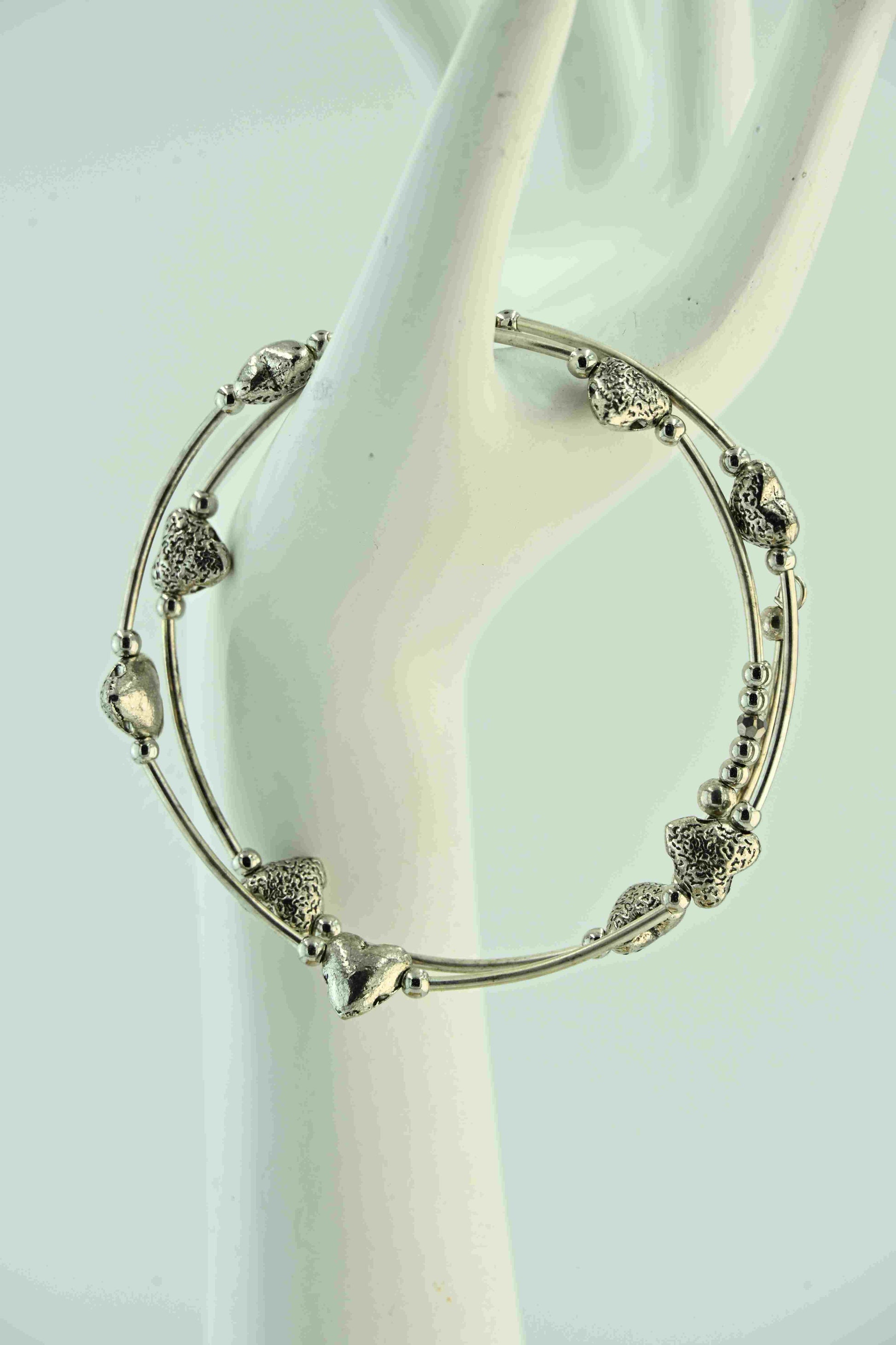 Ręcznie robiona bransoletka handmade w bellamaga, utrzymana w eleganckim, srebrnym kolorze. Ozdobiona dekoracyjnymi przekładkami w kształcie serc oraz drobnymi, gładkimi koralikami. Delikatna, a jednocześnie wyrazista – idealna na co dzień, jak i na wyjątkowe okazje. Doskonały prezent dla osoby, której chcesz podarować odrobinę serca w biżuteryjnej formie.