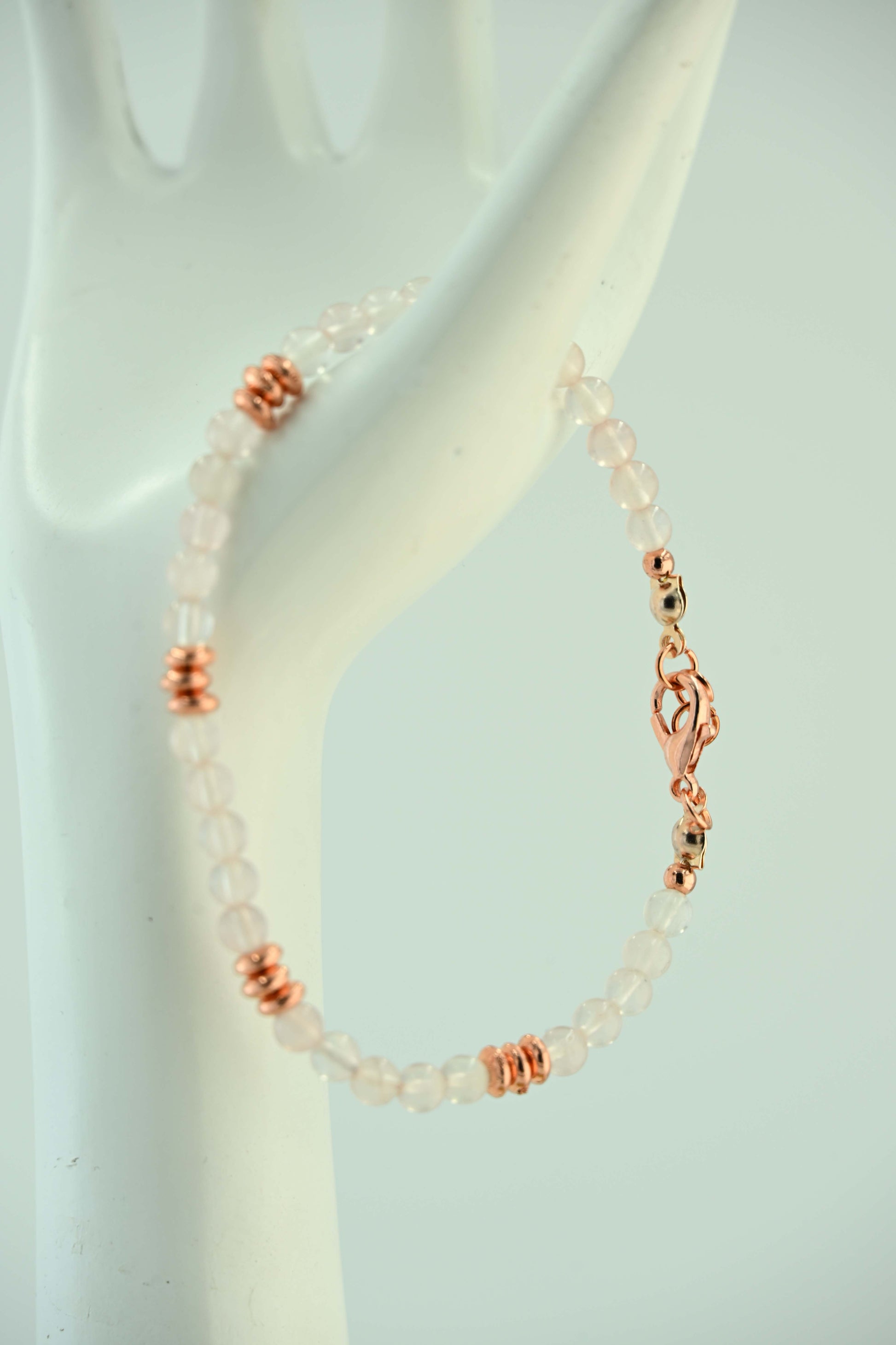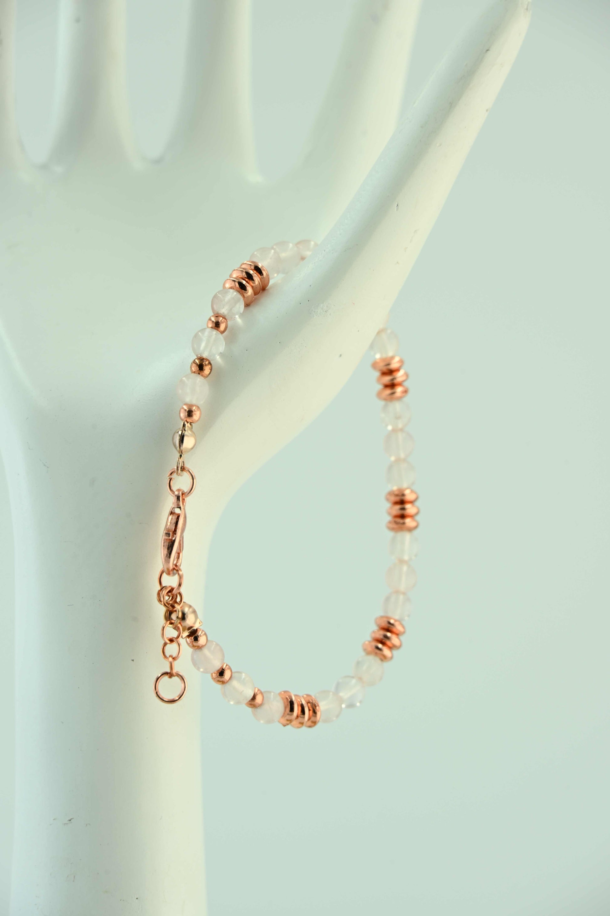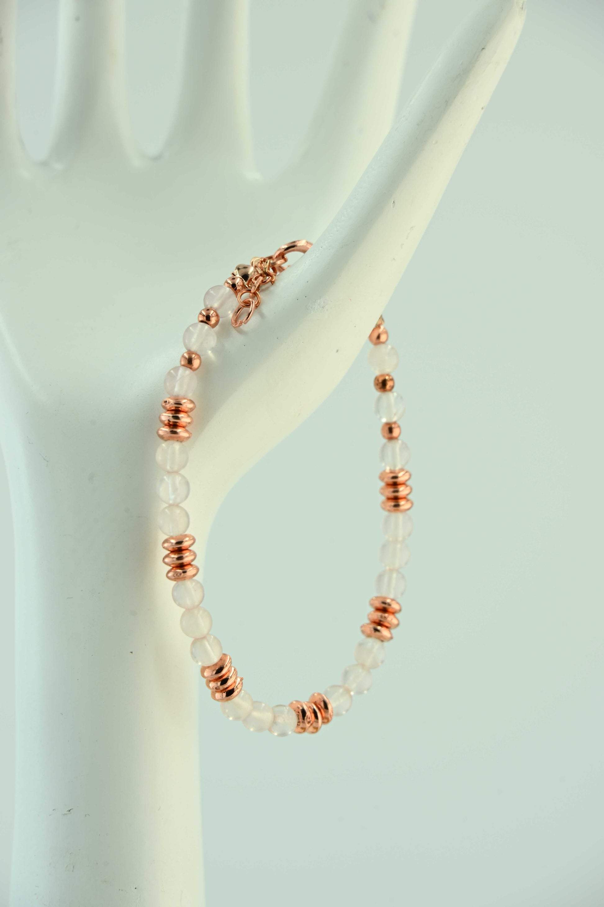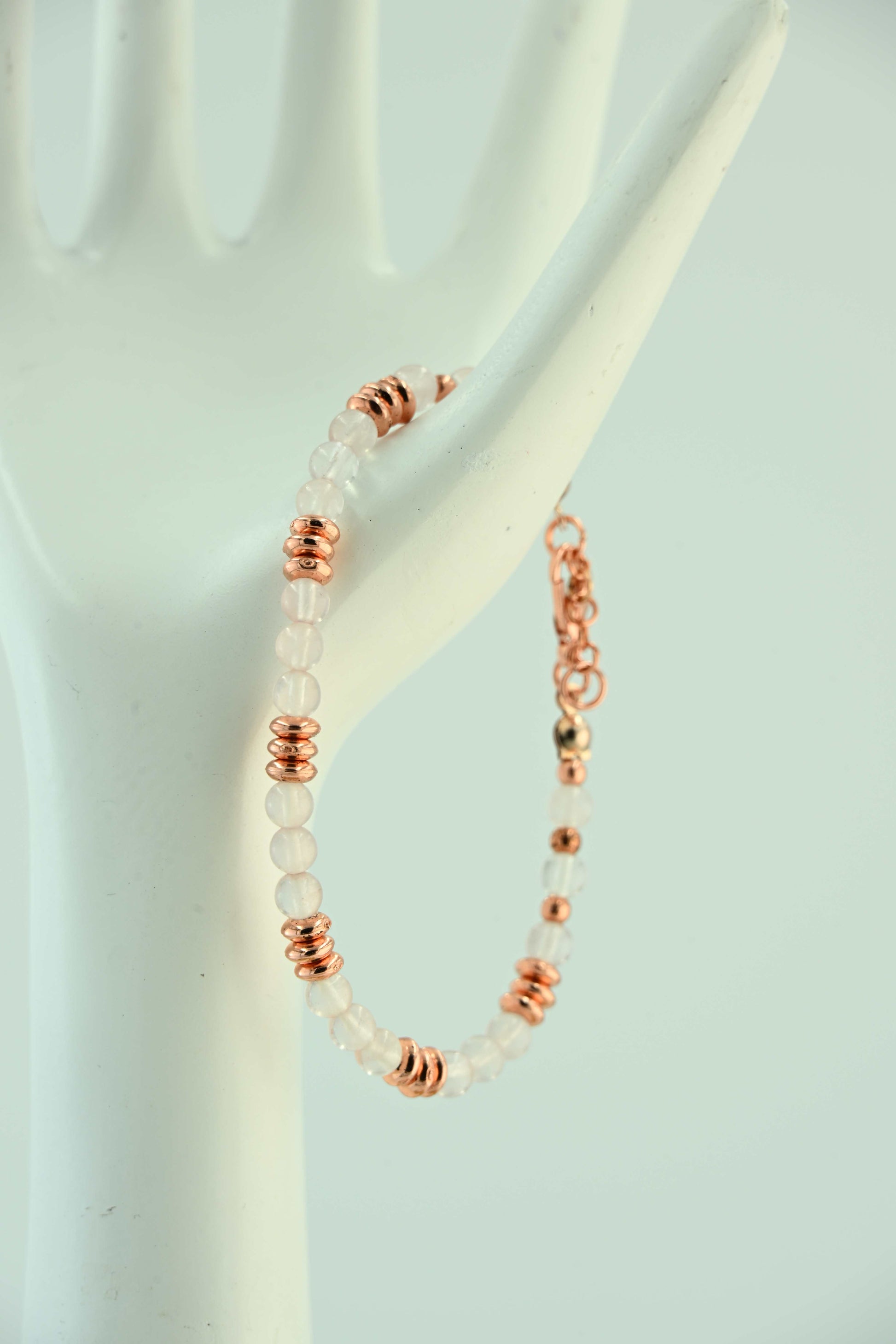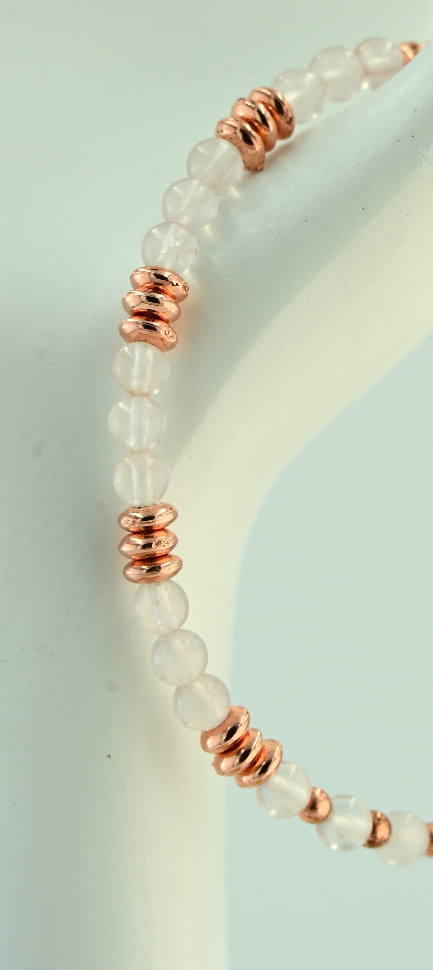 Ręcznie robiona bransoletka handmade w bellamaga, wykonana z naturalnego kamienia księżycowego o subtelnym, mlecznobiałym odcieniu. Eleganckie miedziane przekładki pięknie kontrastują z jasnymi koralikami, dodając całości ciepła i oryginalności. Kamień księżycowy jest symbolem intuicji, kobiecej energii i nowych początków, co czyni tę bransoletkę idealnym talizmanem na co dzień i wyjątkowe okazje.