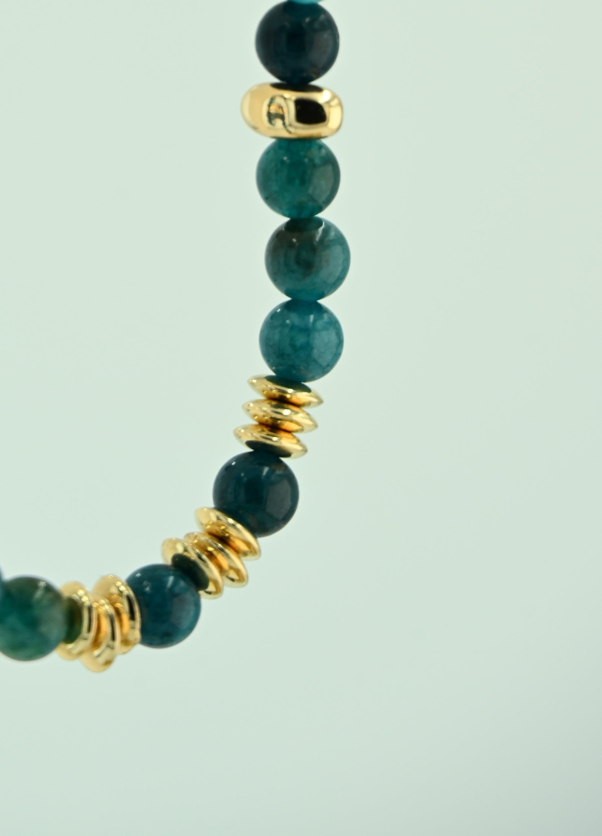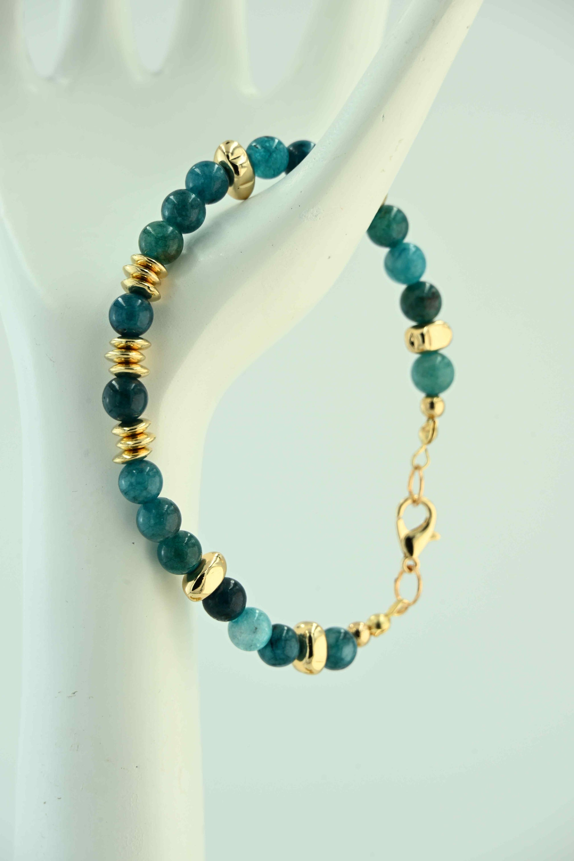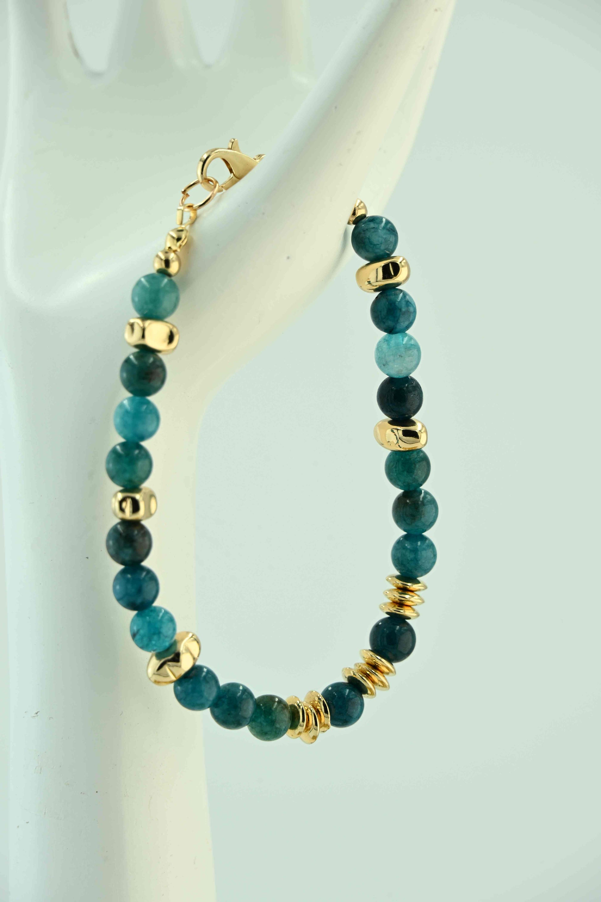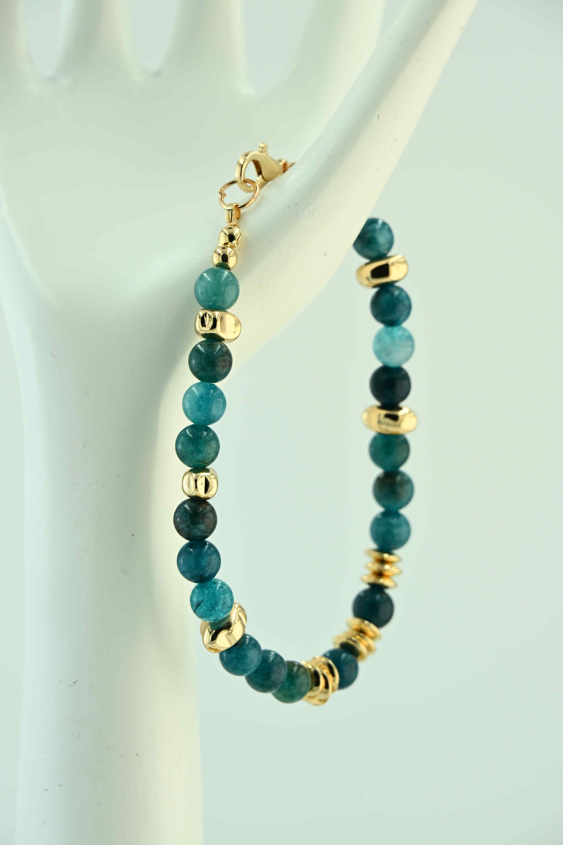 Wyjątkowa bransoletka handmade wykonana ręcznie w bellamaga z dużych, naturalnych kamieni apatytu o intensywnym, morskim odcieniu. Eleganckie złote przekładki dodają całości luksusowego charakteru. Apatyt to kamień motywacji i pozytywnego myślenia – wspiera odwagę w realizacji marzeń. Idealna jako efektowny dodatek do codziennych i wieczorowych stylizacji.