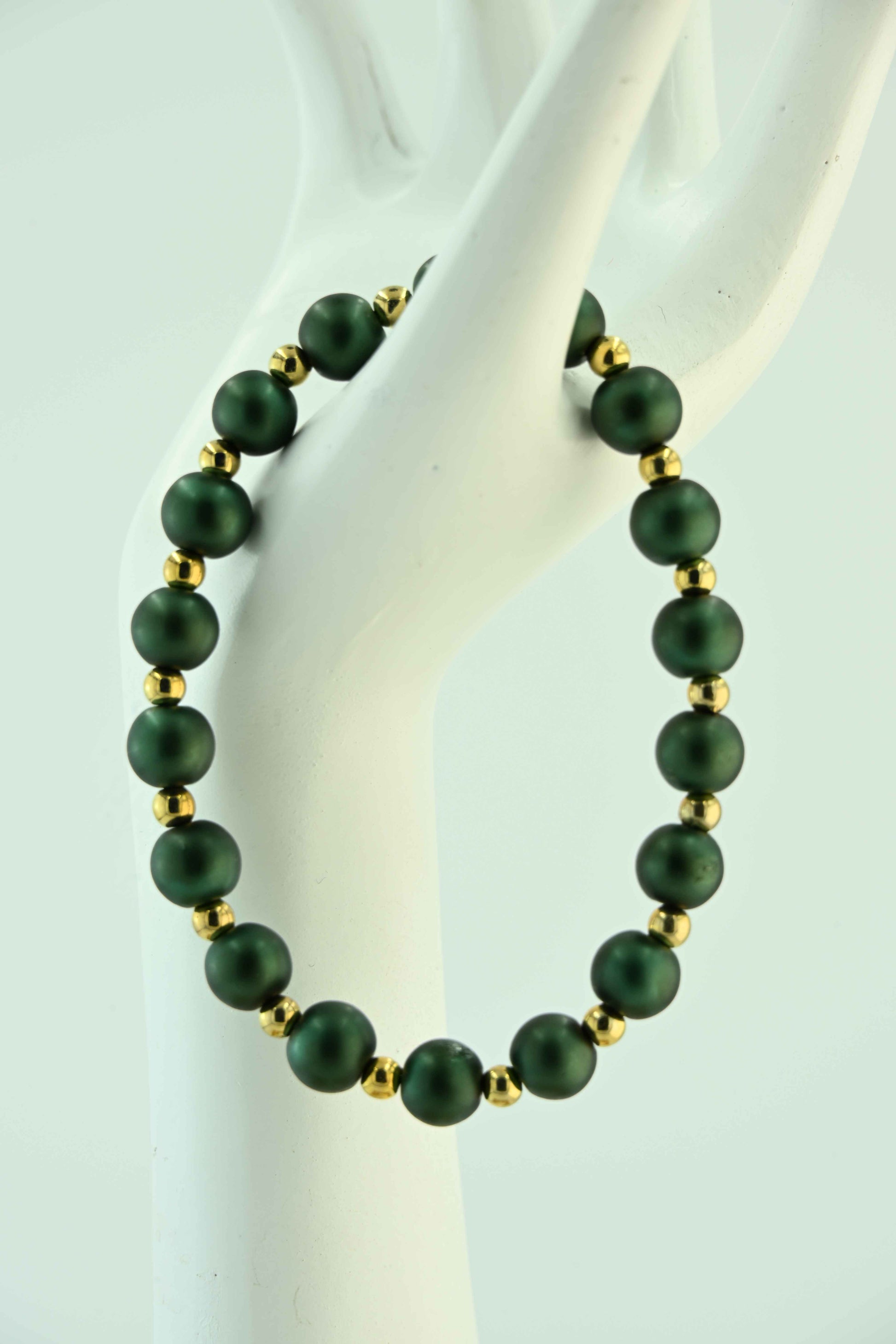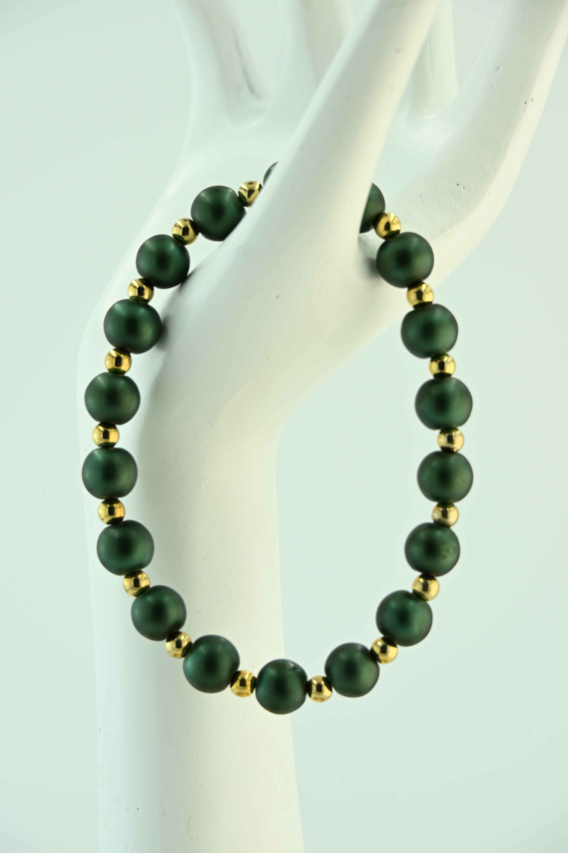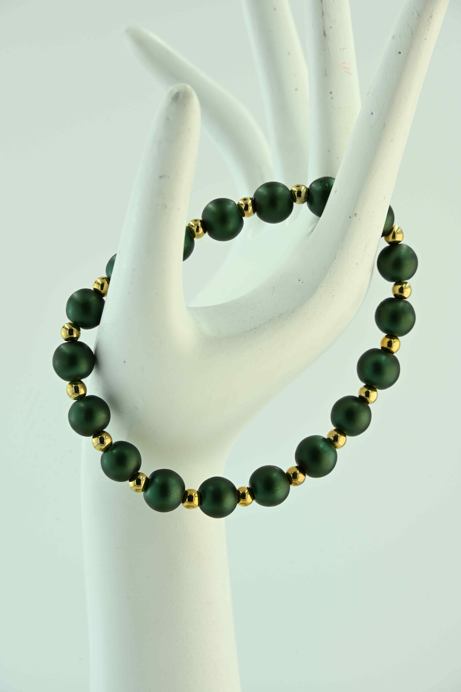 Ręcznie robiona bransoletka handmade w bellamaga, wykonana z matowych koralików w głębokim odcieniu butelkowej zieleni. Eleganckie, złote przekładki dodają całości luksusowego charakteru i pięknie kontrastują z zielenią. Lekka i wygodna, idealna jako dodatek do codziennych stylizacji, jak i wyjątkowych okazji.