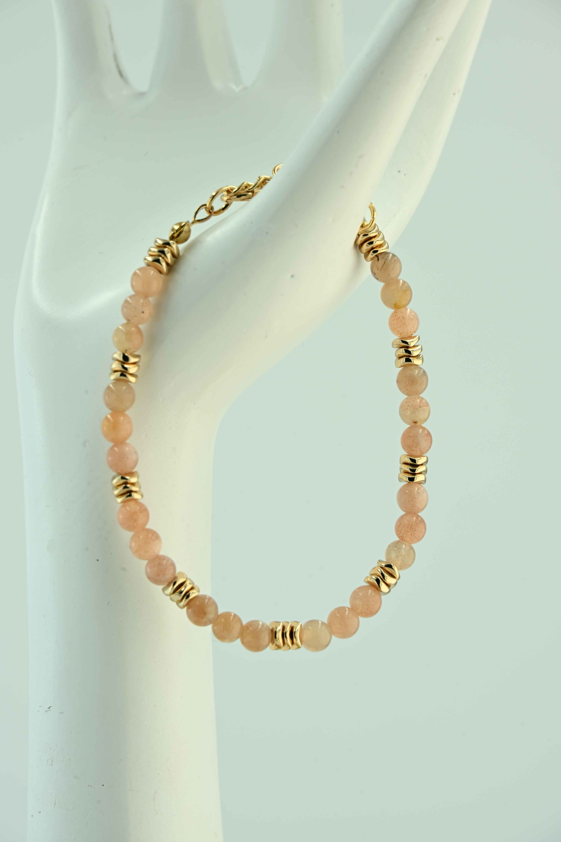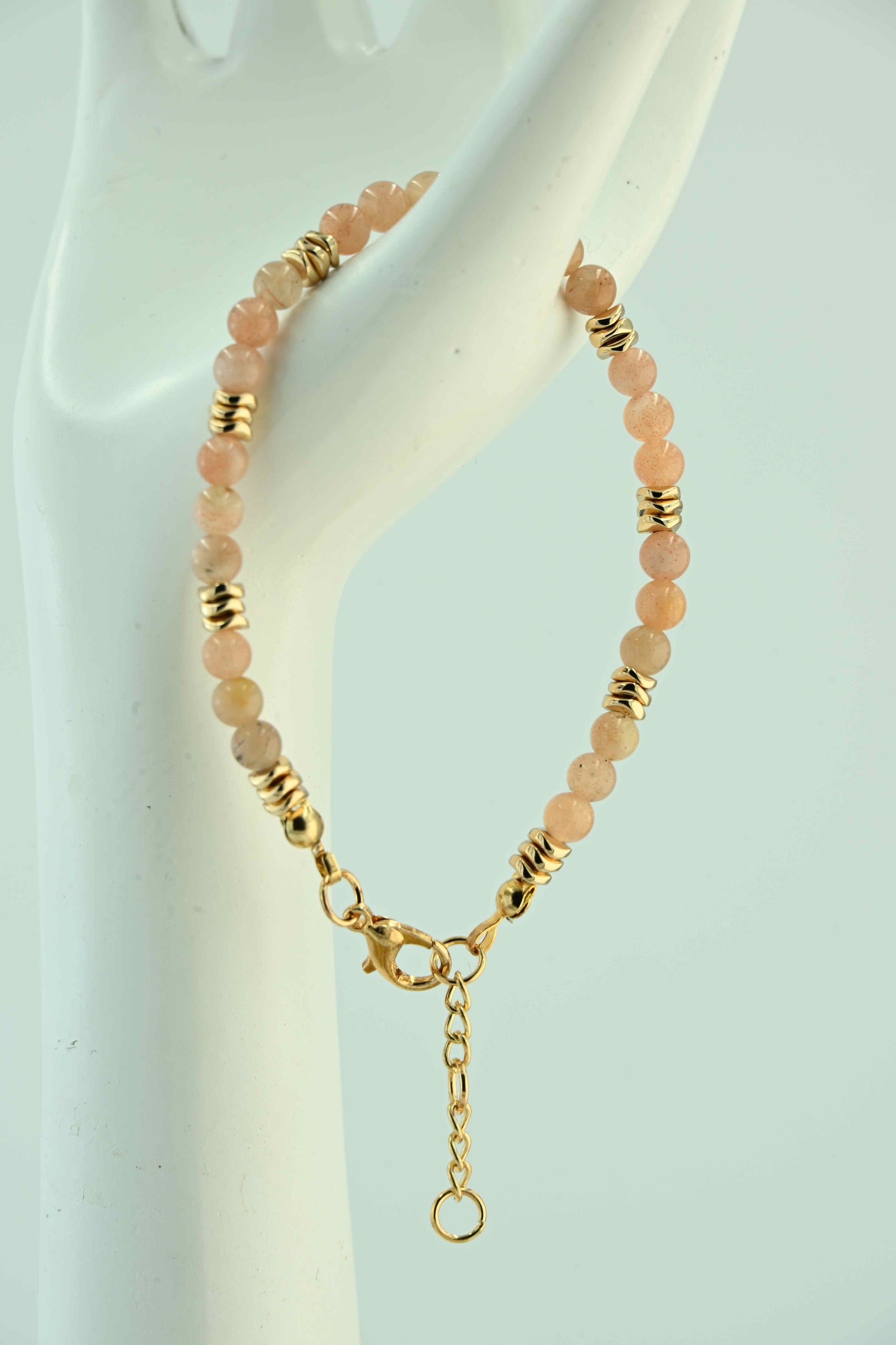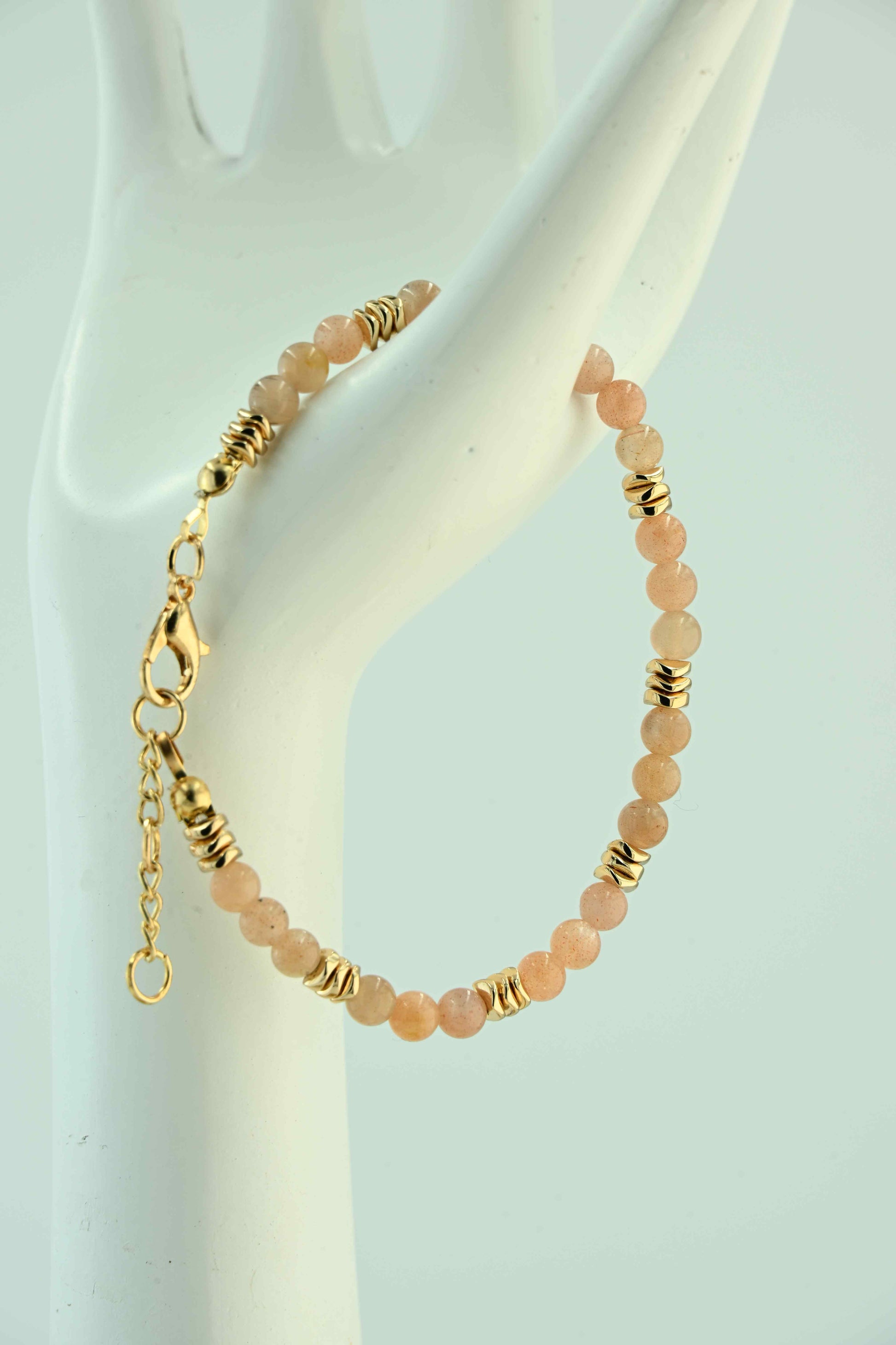 Ręcznie robiona bransoletka handmade w bellamaga, wykonana z naturalnego kamienia słonecznego (sunstone) o ciepłym, złocisto-brzoskwiniowym odcieniu. Eleganckie, złote przekładki podkreślają blask minerału, nadając całości luksusowego charakteru. Kamień słoneczny to symbol radości, optymizmu i energii życiowej – idealny dla osób, które chcą otaczać się pozytywną aurą.