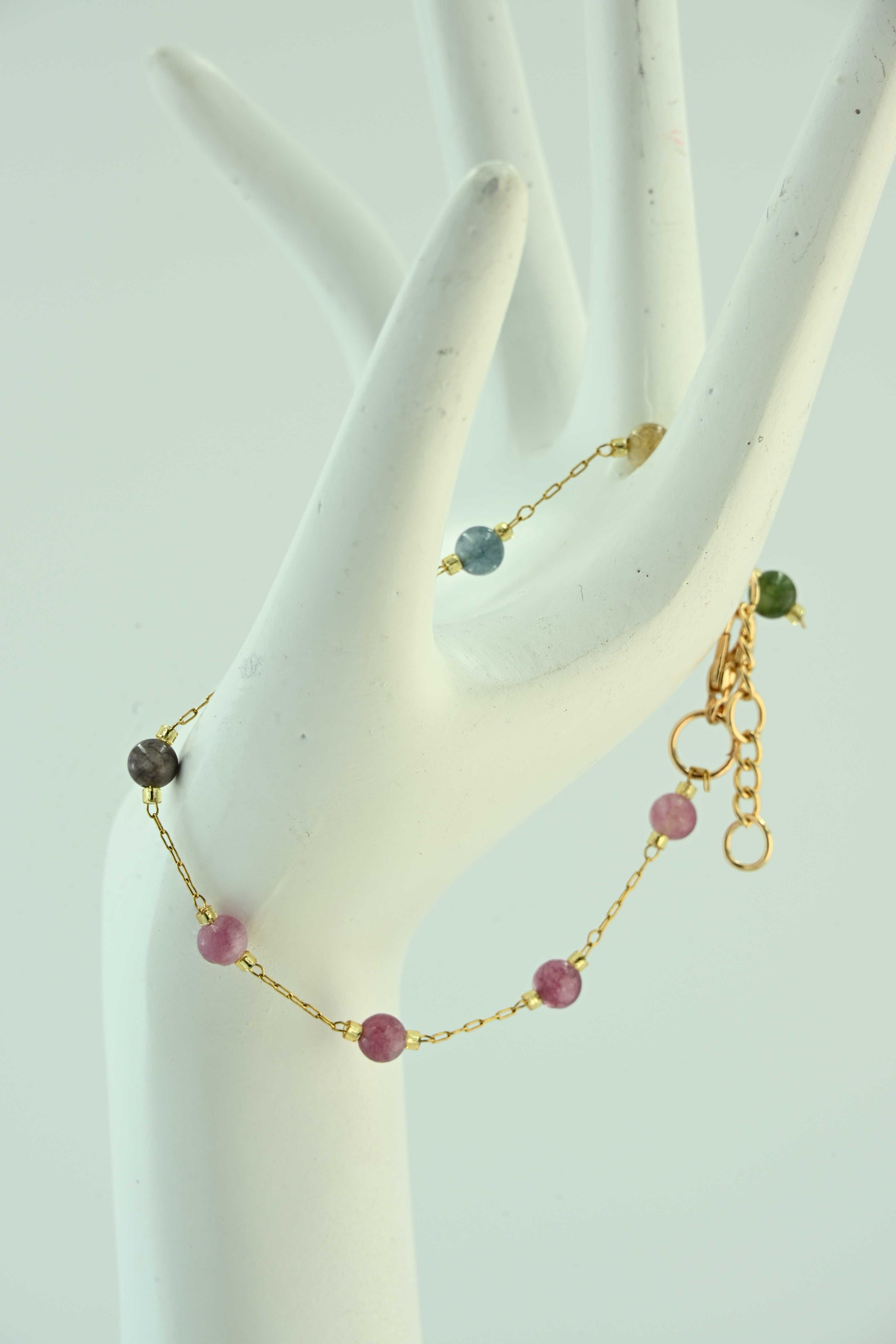 Subtelna i elegancka bransoletka handmade w bellamaga, wykonana na złotym łańcuszku z kolorowymi kamieniami naturalnymi – różowymi, zielonymi, niebieskimi i brązowymi. Delikatne ogniwa łańcuszka pięknie podkreślają barwy kamieni, tworząc harmonijną i lekką kompozycję. Regulowane zapięcie pozwala idealnie dopasować ją do nadgarstka. Doskonała na co dzień oraz jako elegancki dodatek na specjalne okazje.