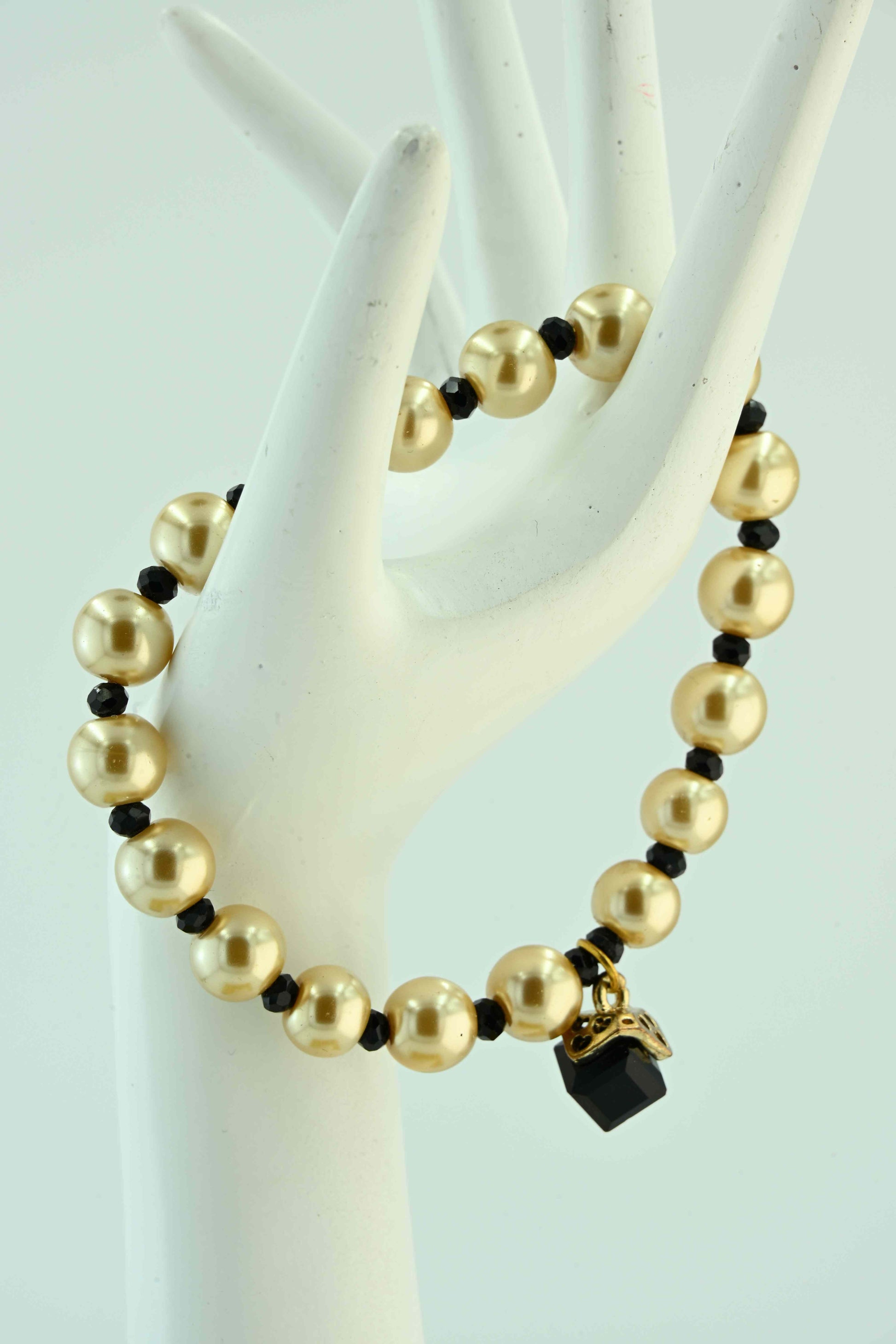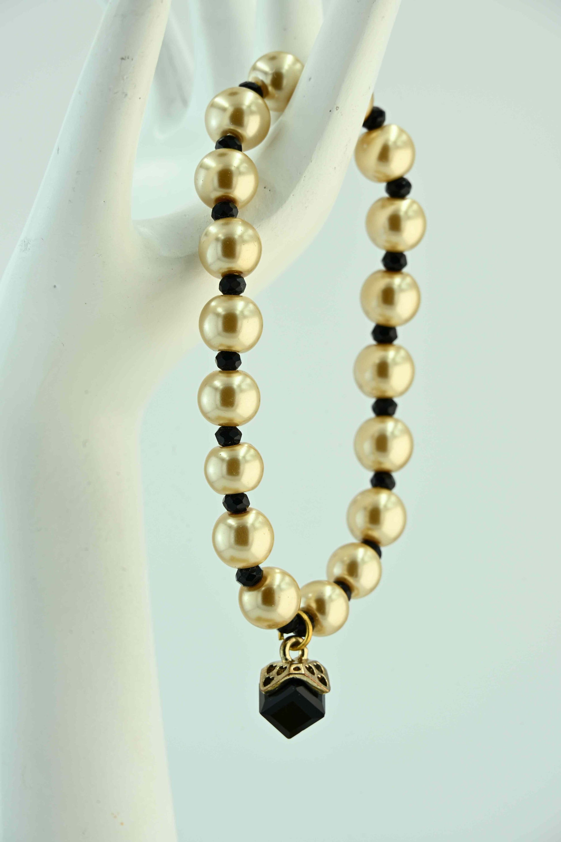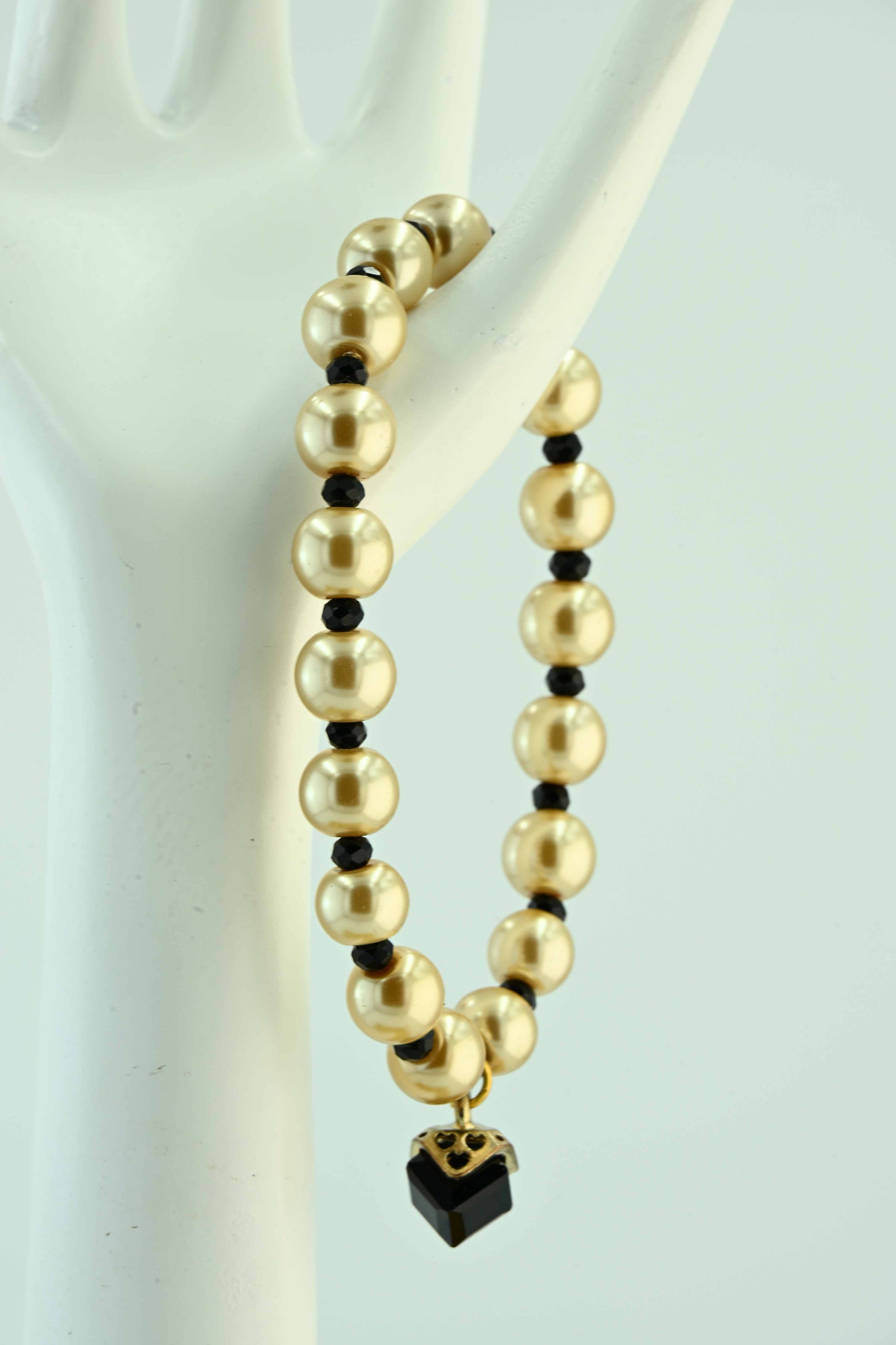 Elegancka bransoletka na elastycznej gumce, wykonana z perłowych koralików w odcieniu złota, przeplatanych drobnymi, czarnymi akcentami. Uroku dodaje zawieszka w formie czarnego kryształka w złotej oprawie, która pięknie odbija światło.