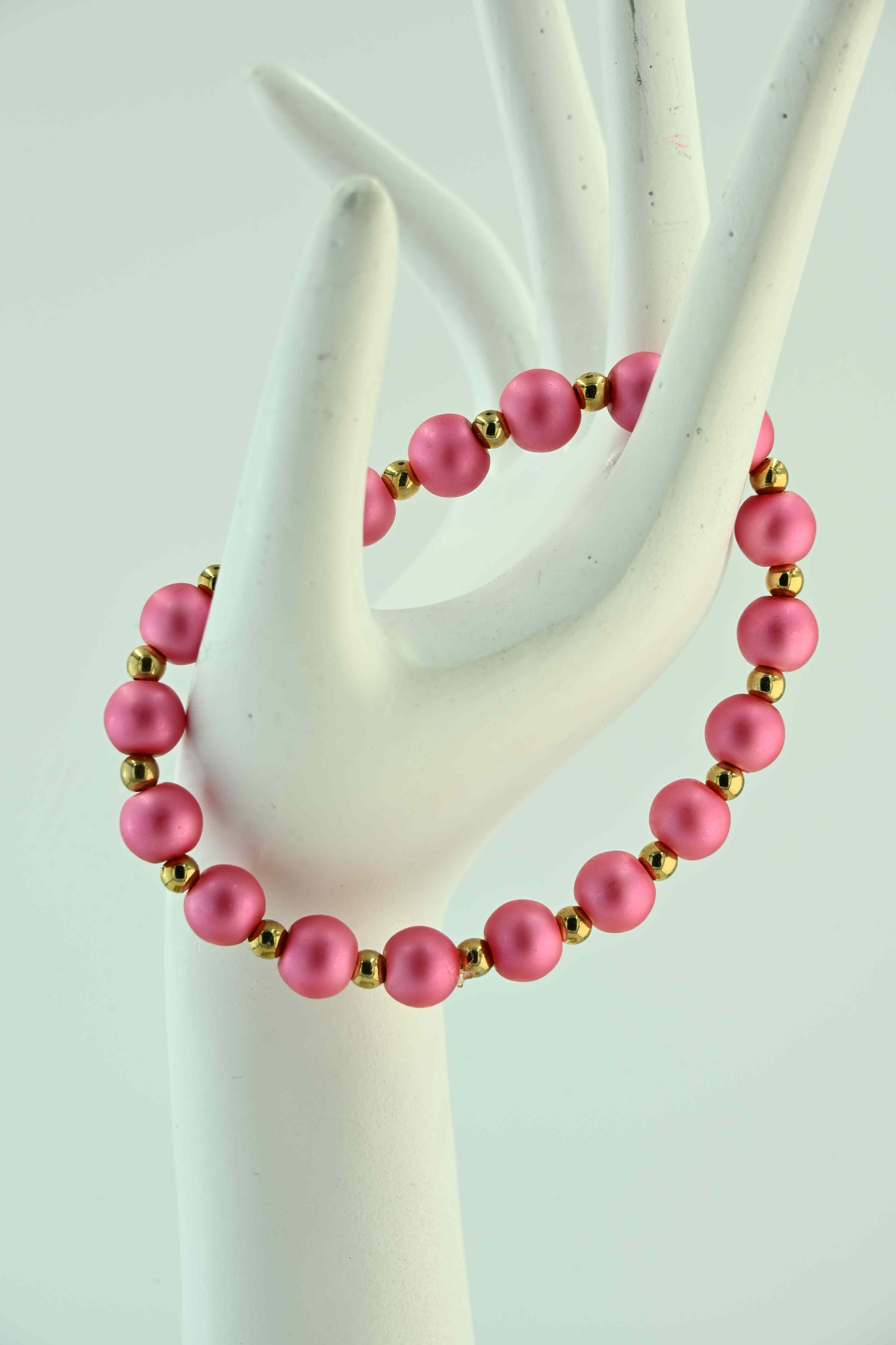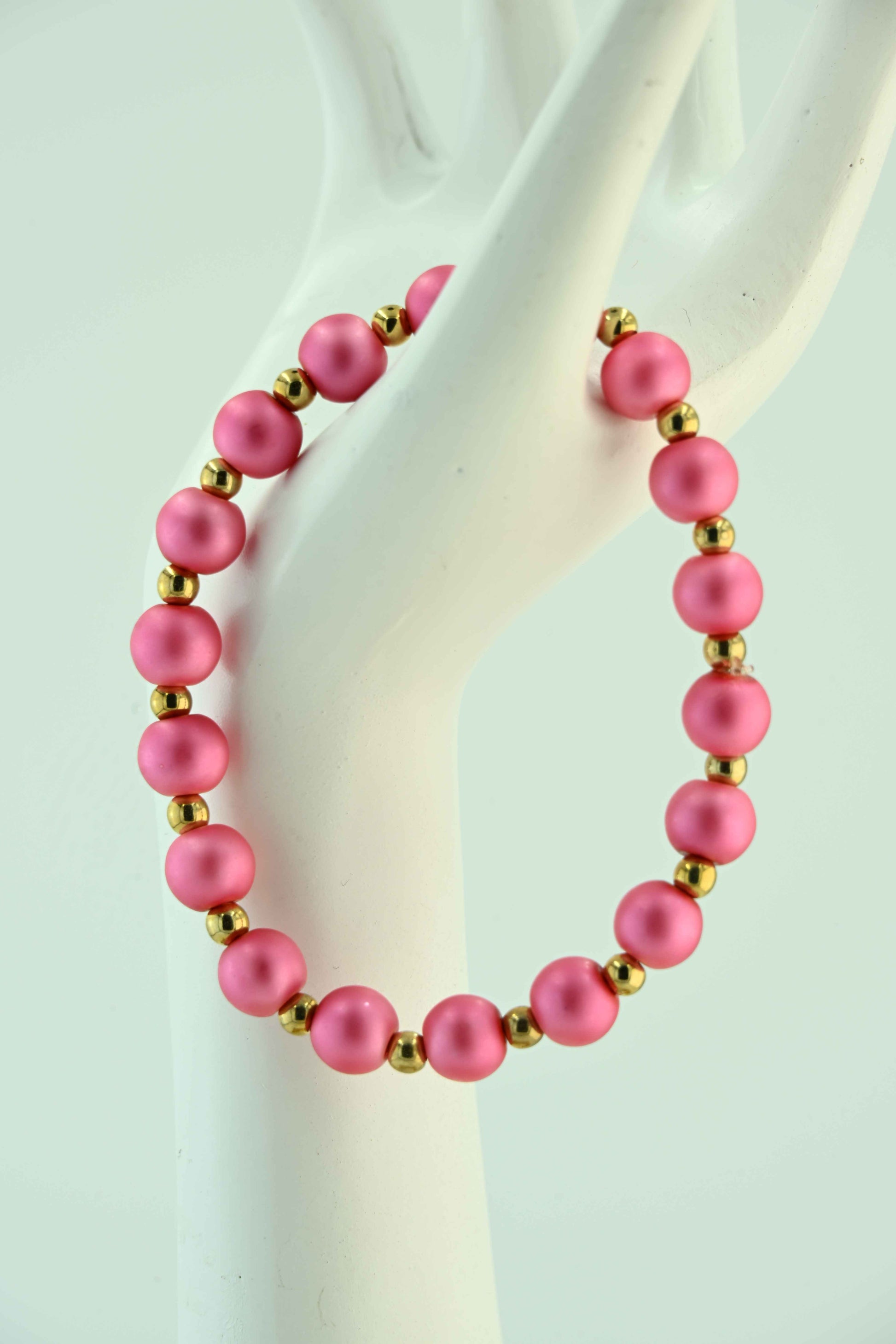 Ręcznie robiona bransoletka handmade w bellamaga, wykonana z matowych koralików w matowym odcieniu różu. Eleganckie, złote przekładki dodają całości luksusowego charakteru i pięknie kontrastują z zielenią. Lekka i wygodna, idealna jako dodatek do codziennych stylizacji, jak i wyjątkowych okazji.