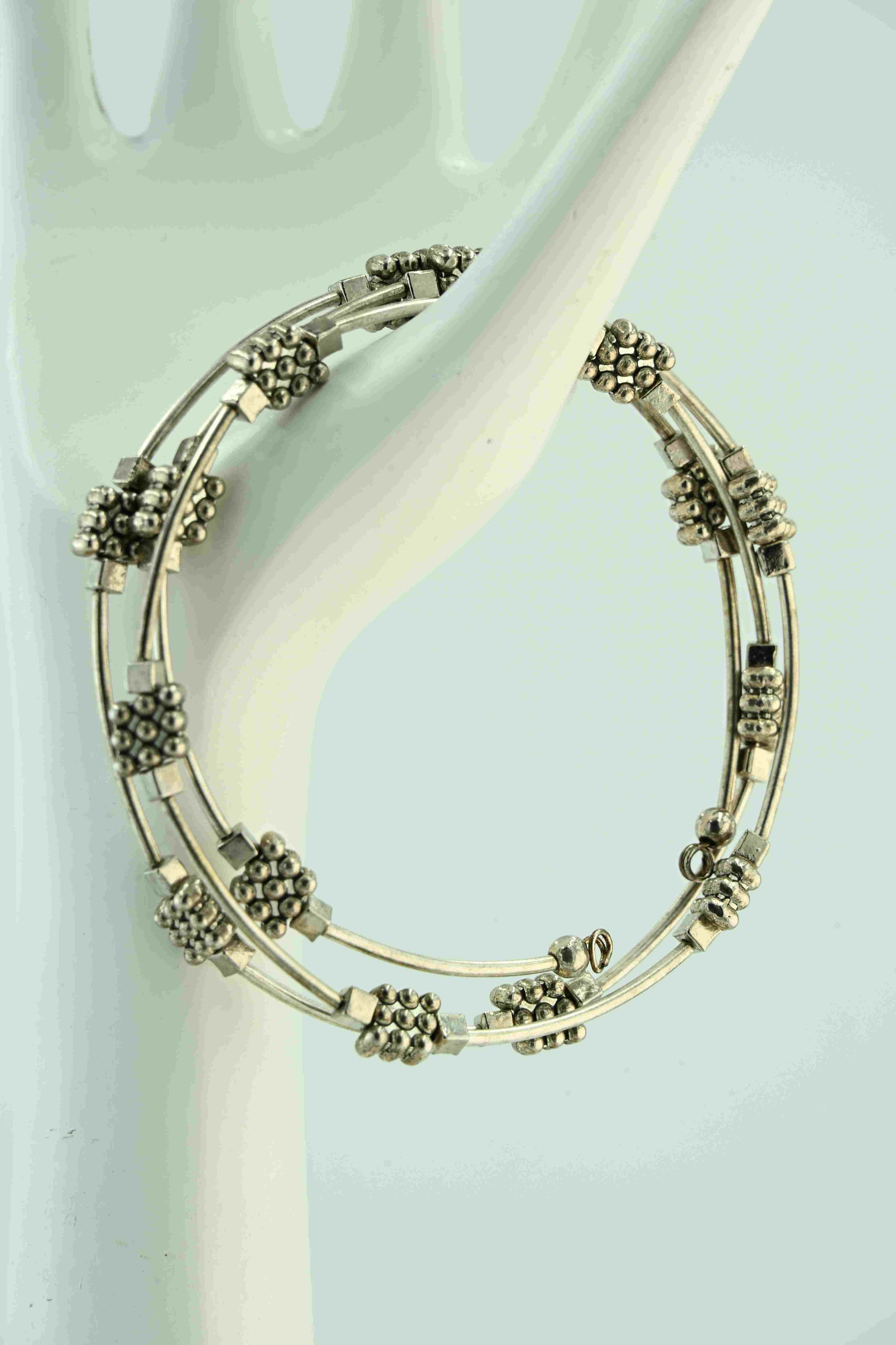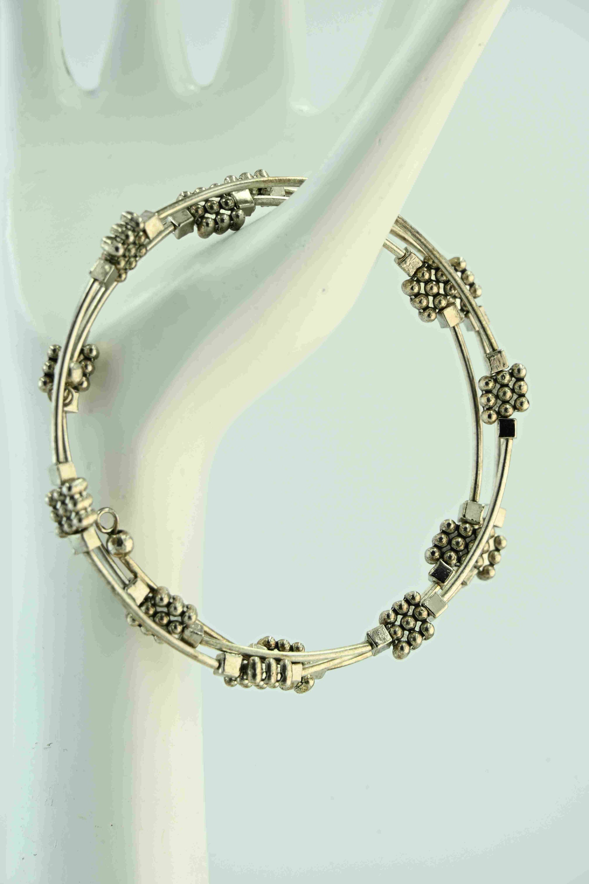 Ręcznie robiona bransoletka handmade w bellamaga, utrzymana w eleganckim, srebrnym kolorze. Ozdobiona ażurowymi elementami oraz charakterystycznymi przekładkami w kształcie kwadratu, które nadają jej nowoczesnego i geometrycznego stylu. Lekka, wygodna i uniwersalna – pasuje zarówno do codziennych, jak i wieczorowych stylizacji.